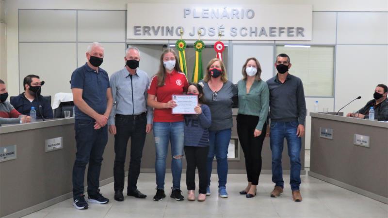 A Câmara de Vereadores de Vera Cruz, fez entrega de uma MOÇÃO CONGRATULATÓRIA a Bruna Wick Roloff, pela convocação para fazer parte da Seleção Brasileira de Futebol Feminino Sub-17.O ato ocorreu durante a Sessão da última segunda-feira, 12 de julho de 2021. A Moção foi protocolada pelos vereadores Flávio Daniel Schunke, Cira Maria Gassen Kaufmann e Luiz Carlos Souza, os quais fizeram a entrega de um certificado da mesma durante a sessão.