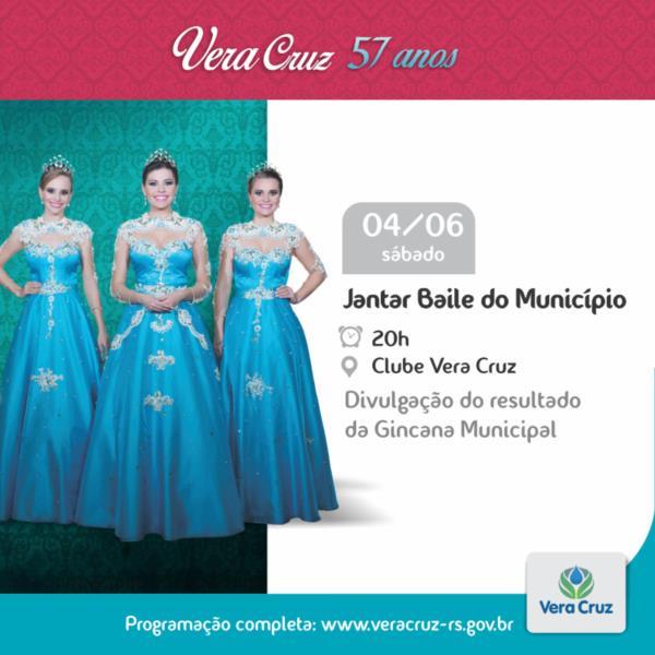 No próximo sábado, dia 4, alusivo ao Aniversário de Vera Cruz, a Prefeitura Municipal realiza o tradicional Jantar Baile do Município, evento em que acontece também, a divulgação do resultado da Gincana. Os ingressos estarão à disposição apenas no Clube Cultural e Esportivo Vera Cruz, a partir das 13h30 da próxima quarta-feira, dia 1°, no valor de R$ 35,00. Cada equipe de Gincana receberá a quantia de 60 ingressos mediante pagamento total do valor para serem distribuídos entre os integrantes.