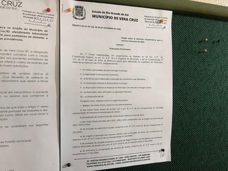 Mártin Fernando Nyland, Presidente da Câmara de Vereadores do Município de Vera Cruz, Estado do Rio Grande do Sul, na forma do Art. 48, da Lei Complementar nº 101, de 04 de maio de 2000, que estabelece normas de finanças públicas voltadas para a responsabilidade na gestão fiscal, CONVOCA as entidades sindicais, associações de bairros, entidades culturais e esportivas, grupos organizados e comunidade em geral, para a Audiência Pública de discussão do Projeto de Lei nº 134/2024, que ?Dispõe sobre as diretrizes orçamentárias para o exercício financeiro de 2025?, a ser realizada no dia 24 de setembro de 2024, com início às 15:00 horas na Câmara de Vereadores de Vera Cruz, situada na Avenida Nestor Frederico Henn, n° 1580, Vera Cruz.