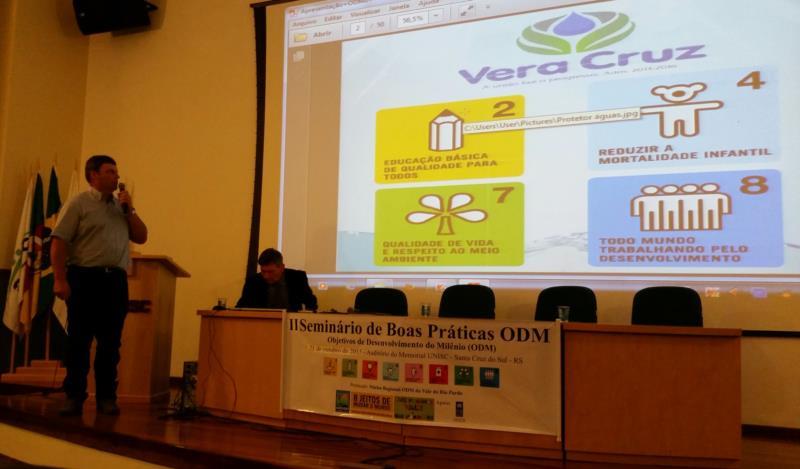 O projeto pioneiro no Rio Grande do Sul, Protetor das Águas, do Município de Vera Cruz, mais uma vez ganhou notoriedade na Região dos Vales. Na última semana, o projeto foi apresentado no II Seminário Regional de Boas Práticas ? Objetivos de Desenvolvimento do Milênio (ODM). O evento foi promovido pelo Núcleo Regional ODM do Vale do Rio Pardo e aconteceu no Memorial da Universidade de Santa Cruz do Sul (Unisc) a fim de apresentar os principais projetos e ações implantadas nos municípios que compõem a Associação dos Municípios do Vale do Rio Pardo (Amvarp) e seus impactos na qualidade de vida da população.
