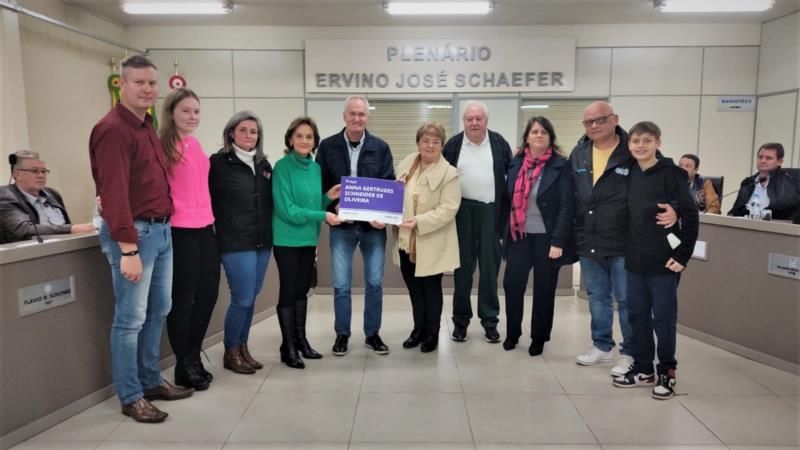 Na Sessão Ordinária da Câmara Municipal da última segunda-feira, 16 de agosto, o Poder Legislativo prestou homenagens. Uma delas foi a Denominação de Praça Anna Gertrudes Schneider de Oliveira, espaço público, no Município de Vera Cruz, de autoria do Vereador Flávio Daniel Schunke, que prestou uma linda homenagem e a entrega de uma placa simbólica para familiares presentes.