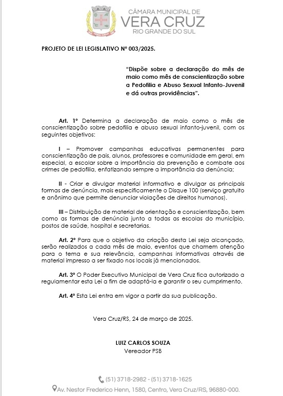 Na última sessão ordinária da Câmara Municipal, realizada na segunda-feira (31), os vereadores demonstraram total compromisso com a proteção das crianças e adolescentes ao aprovar por unanimidade o Projeto de Lei de autoria do Vereador Luiz Carlos Souza, que declara o mês de maio como o Mês de Conscientização sobre a Pedofilia e o Abuso Sexual Infanto-Juvenil.Esse Projeto tem como objetivo ampliar o debate, promover ações educativas e fortalecer a rede de proteção às crianças e adolescentes, incentivando a denúncia e a prevenção desses crimes tão graves.A conscientização é essencial para garantir um ambiente seguro e saudável para nossas crianças e jovens. Proteger a infância é um dever de todos! Denuncie! Disque 100.