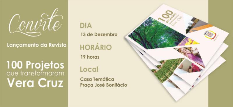 A Prefeitura Municipal de Vera Cruz lança nesta terça-feira, dia 13, a revista Os 100 projetos que transformaram Vera Cruz. O impresso de prestação de contas tem 44 páginas que relatam as principais realizações dos oito anos de gestão da prefeita Rosane Petry e dos vice-prefeitos, Haroldo Genehr (2009-2012) e Loreno Nyland (2013-2016). O lançamento inicia às 19 horas na Casa Temática da Praça José Bonifácio e na oportunidade acontecerá também a entrega do Calendário Oficial de Eventos do município.